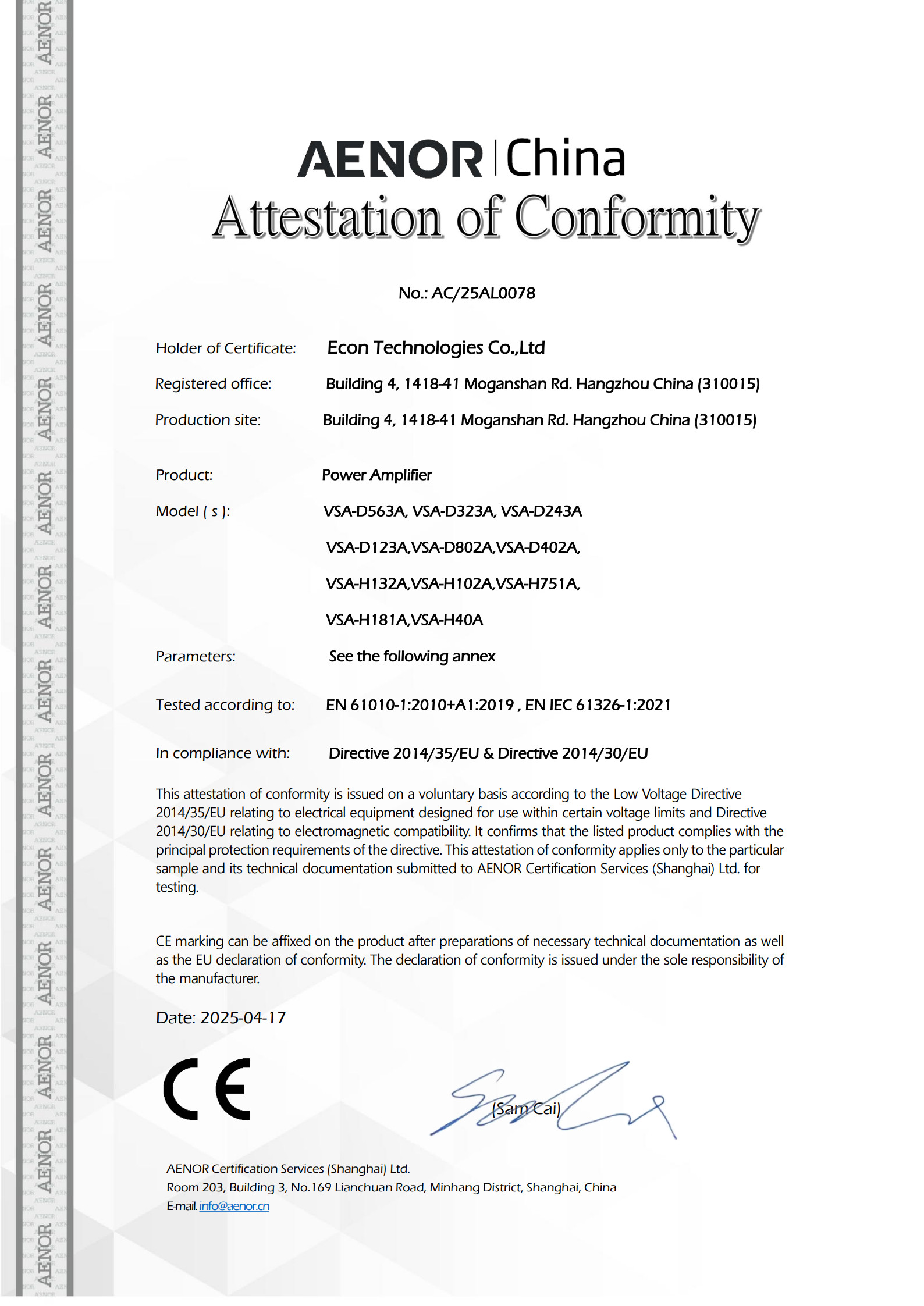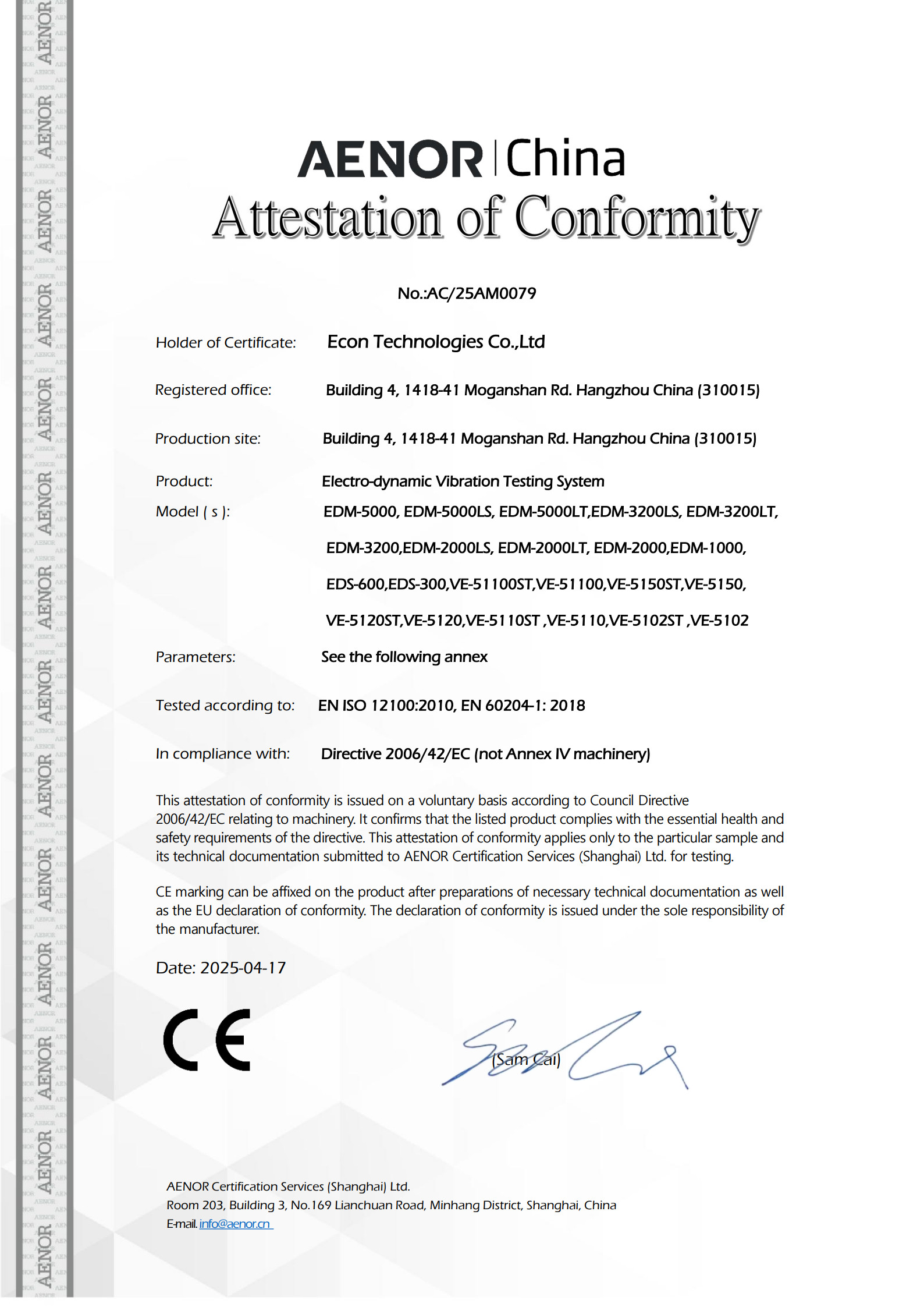 杭州易恒科技有限公司が独自に開発したパワーアンプ(VSAシリーズ)と動電振動試験システム(EDM/EDS/VEシリーズ)が正式にEU CE認証に合格しました(番号:AC/25AL0078、AC/25AM0079)。