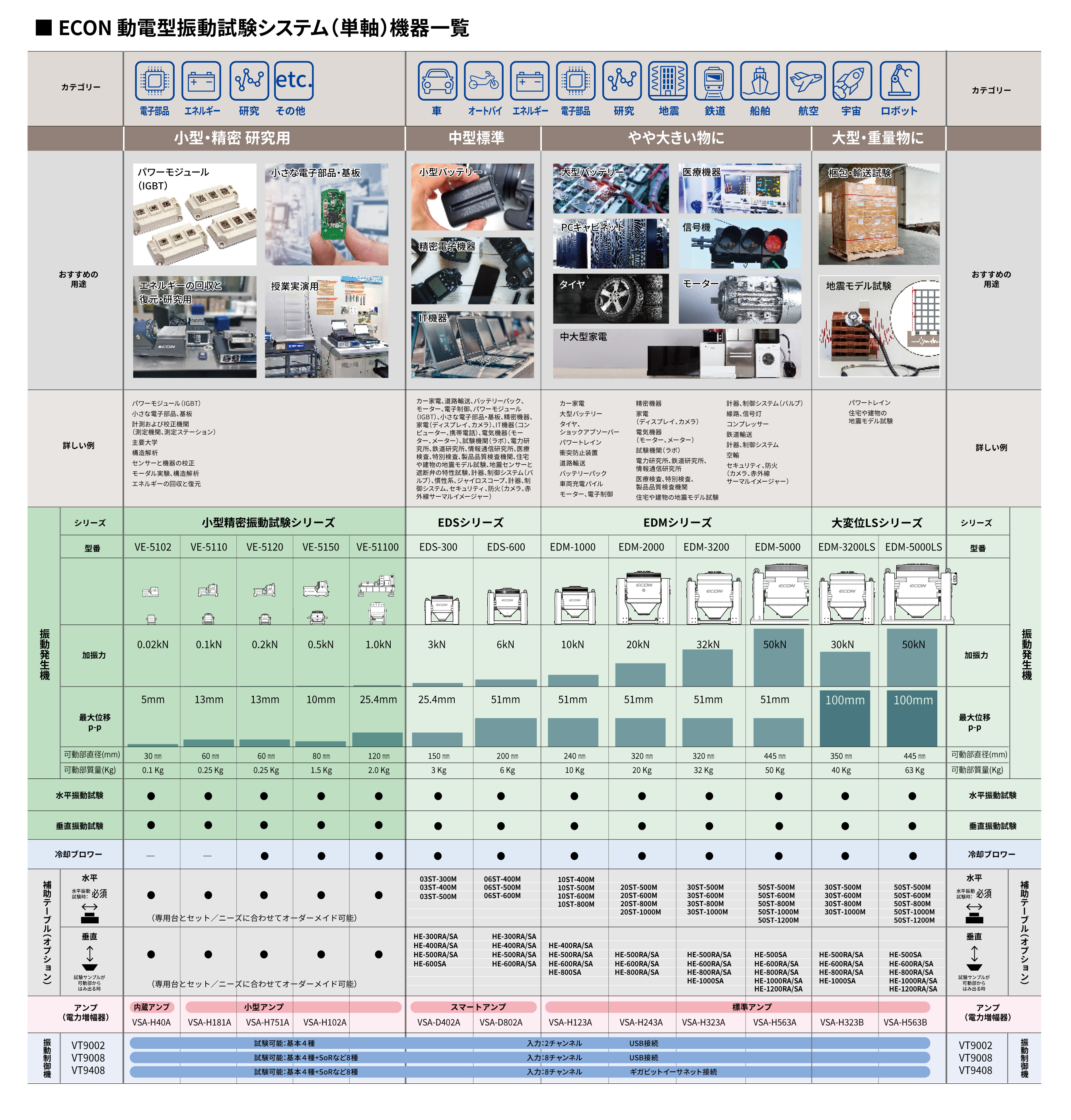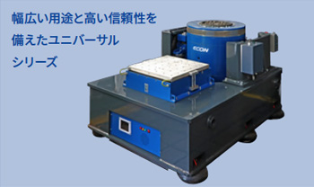 ECONの動電型振動試験装置は、振動発生器本体、振動コントローラー、アンプ(電力増幅器)、冷却用ブロアで構成され、 多彩な補助テーブルが選択でき、水平/垂直方向の振動試験が可能です。