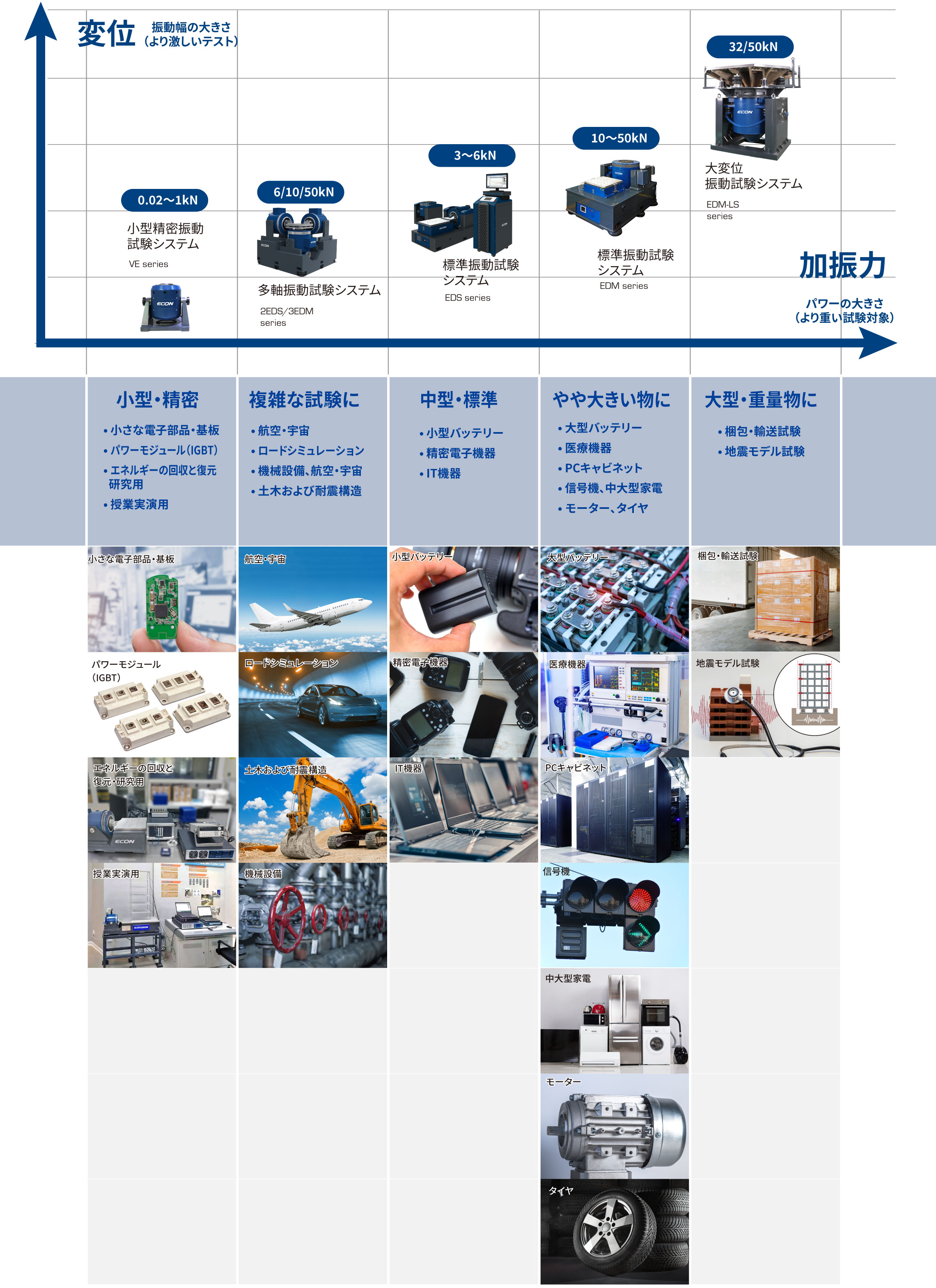 イーコン・テクノロジーの振動試験システムは、必要とされる様々なシチュエーションに応じ、小型から大型のものまで幅広いラインナップがあります。※変位の幅が大きいほど、より負荷の高い試験ができ、加振力が大きいほど、より大きな物を試験可能です。