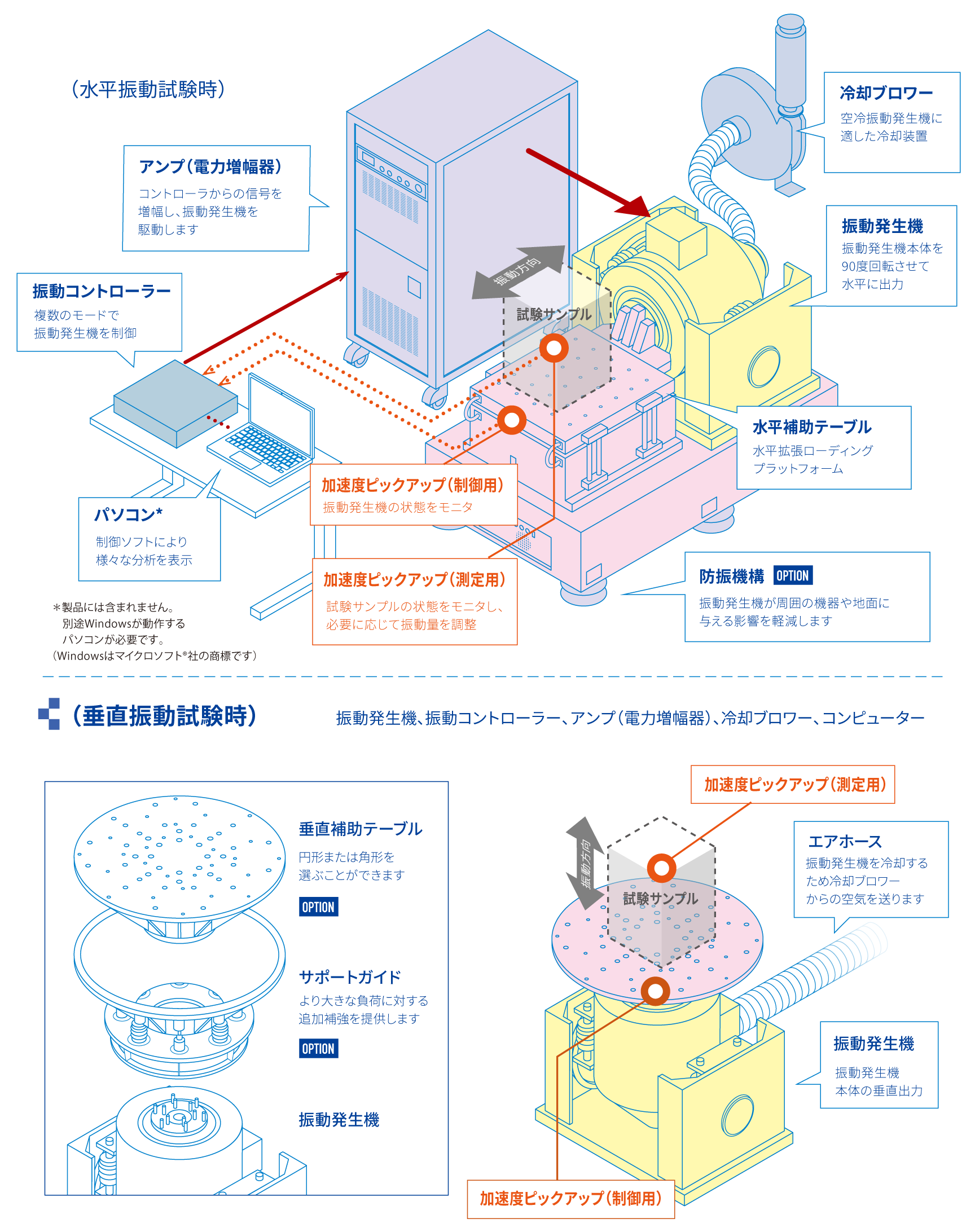 動電型振動試験システムは、振動発生器本体、振動コントローラー、アンプ(電力増幅器)、冷却用ブロア、加速度ピックアップ(センサー)、 専門的なソフトウェアで構成されています。また、様々な補助テーブルが選択できるなど多彩なオプションが選択でき、 水平/垂直方向どちらの振動試験でも行えます。
